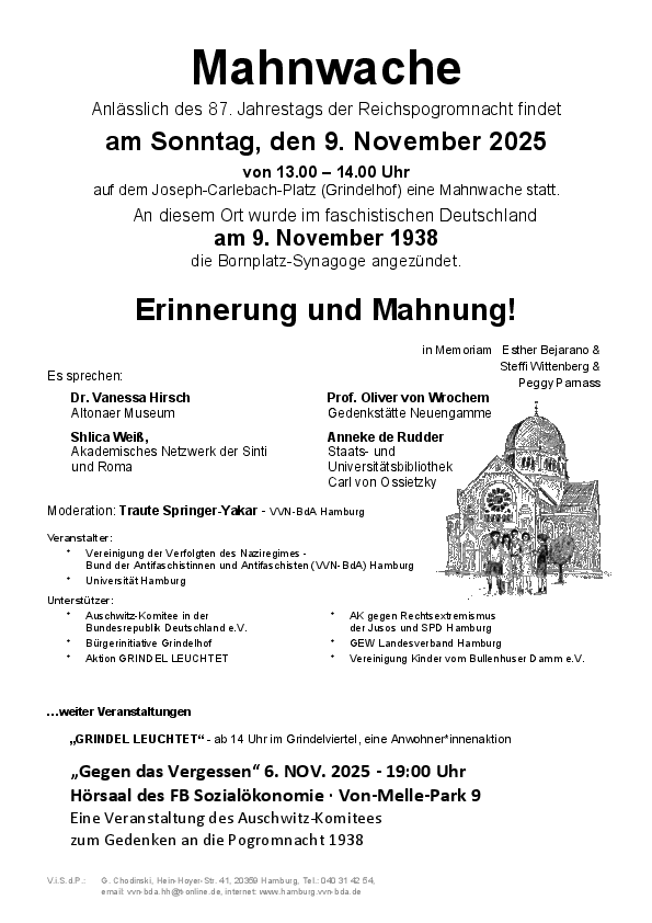 Am 9.11.25 Mahnwache anlässlich des 87. Jahrestags der Reichspogromnacht in Memoriam Esther Bejarano & Steffi Wittenberg & Peggy Parnass